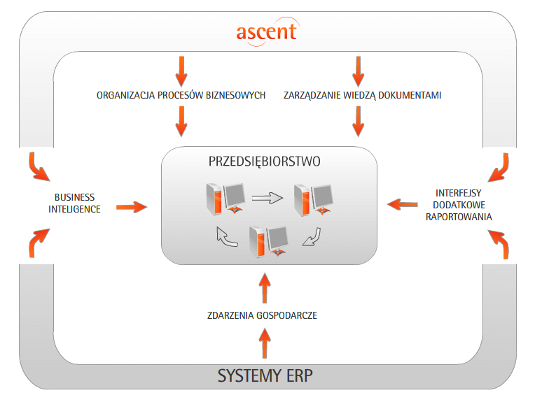 Konsekwencją funkcjonowania systemu ERP jest nowy poziom aktywności przedsiębiorstwa. Poziom suwerenny, o strukturze danych nie przystającej do przetwarzanych przez systemy ERP informacji. Obsługę tego poziomu ma zapewniać właśnie system Ascent Workflow.